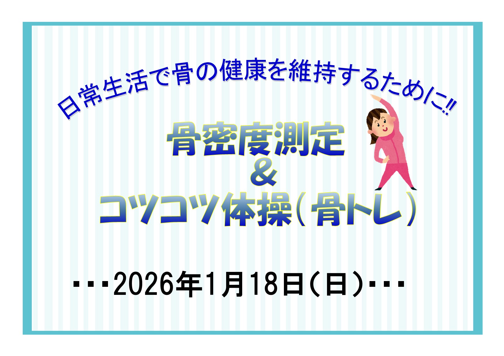| 令和8年1月18日(日) ➀ 9:30~11:00(定員16人) ②10:40~12:10(定員16人) ※骨密度測定約1時間+体操30分 |